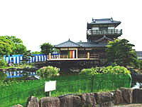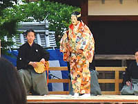 ![]() 池田城の能舞台(中央) 最初は子供による太鼓や仕舞 平惟盛を慰めて舞う「千手」 |