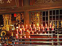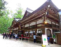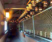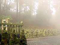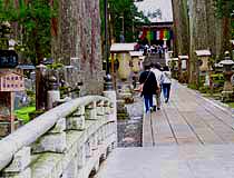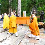 | 【奥の院】 奇しくも今日は弘法大師の月命日21日にあたり、運良く学徒僧やお坊様の行列に出会ったり、お大師様へお食事を運ぶ儀式に出会えた。 大門 : 高野山の総門で、重層の大楼門。門の両脇には阿形・康意、吽形・運長の作で高さ4,8mの金剛力士像がある。 御供所 : 弘法大師のお食事を作る台所。他に、納経所・護摩堂・寺務所・休憩所となる頌徳殿(しょうとくでん)などがある。 生身供の儀式 : 空海が入定(死)後もこの廟で瞑想を続けている信じられ、1200年間一日2回御廟へ食事が届けられている。御供所で調理されたお食事は甞試アジミ地蔵で味見され、箱に納めて二人の僧が運ぶ。先頭に維那ユイナ(僧侶の職名)が案内に立ち、御廟橋を渡って燈龍堂へお供えした後、読経し、御供所へ戻る。 御廟橋 : 御廟へと向かう参道最後の橋。服装を正し、一礼してから渡るのが参拝の作法。橋は36枚の橋板と橋全体を合わせて37枚と数えられ、金剛界37尊を表し、橋板の裏に梵字で36尊を表している。 御廟(燈龍堂) : 奥の院・御廟橋の正面にある檜皮葺・宝形造の建物。空海自らが場所を定め、翌835年3月21日に入定(死)。 最も尊いとされる?燭の燈籠が無数に天井より吊り下げられている。この燈籠堂の裏側に回り、お札を納札箱にお納め遍路満願のご報告をして最後のお参りを行う。弘法大師はこの燈籠堂の地下法場におられる。 水向地蔵 : 先祖を供養するために地蔵菩薩・不動明王・観音菩薩・聖観音など15体の金剛仏が並ぶ。 |