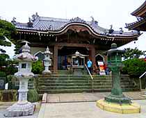 | 第86番札所 補陀洛山 志度寺 宗派: 真言宗 善通寺派 本尊: 十一面観世音菩薩 開基: 藤原不比等 創建: 推古33年(625) 真言: おん まか きゃろにきゃ そわか 歴史・由来 香川県東部、志度湾に面して建立される志度寺。海の向こうはるかには、屋島や五剣山の稜線を望めます。開創は古く推古天皇33年(625)、四国霊場屈指の古刹です。海洋技能集団海人族の凡園子(おおしそのこ)が霊木を刻み、十一面観音(かんのん)像を彫り、精舎を建てたのが始まりと言われ、その後、藤原鎌足の息子、藤原不比等が妻の墓を建立し「死度道場」と名づけられました。その息子房前の時代、持統天皇7年(693)、行基とともに堂宇を拡張し、学問の道場として栄えました。能楽の作品「海士(あま)」の舞台としても語り継がれています。 室町時代には、四国管領の細川氏の寄進により繁栄するが、戦国時代に荒廃。その後、藤原氏末裔、生駒親正(安土桃山時代、信長や秀吉などに仕える)による支援を経て、寛文10年(1671年)高松藩主松平頼重の寄進などにより再興されました。志度は、江戸時代の奇才平賀源内の故郷であり、近くに記念館があります。 見どころ 平賀源内の墓: 志度寺には仁王門前南側に、香川県さぬき市志度出身の、江戸時代の発明家・平賀源内のお墓がある。 仁王門(国指定重要文化財):門全長の突き当り、運慶の力作・仁王像と巨大わらじが迎えてくれる全国的にも珍しい三棟造りの堂々とした侘まい。本堂とともに讃岐藩主・松平頼重によりきしんされた。 閻魔像: 志度寺の演技によると、志度寺の閻魔大王は、本尊の十一面観音と同体とされ、頭上に十一面の仏面を頂く姿で、極楽往生・甦生の閻魔とされている。閻魔堂にあんちされている閻魔大王像は室町時代の中頃に等身大の像を造るように命じて自ら体を採寸して与え、「弥陀」という尼僧を甦生させたと伝わる。閻魔大王の顔は参拝する人のその時の心の在りようによって、怖く見えたり優しく見えたりすると言われている。 本堂・本尊(国指定重要文化財) 海女の墓: (能楽でも詠まれる藤原家にまつわる悲話の舞台、藤原房前が母のために建立したと言われる「海女の墓」が約20基並んでいます。海女の命日である7月16日には、「志度寺の十六度市」が開催されていた。(現在は中止)この日は年に一度、本尊十一面観音の御開帳を行っている。) 曲水式庭園・無染庭(むぜんてい): 室町時代の作庭で、天に向かいそびえる力強い石組が印象的。書院の正面に作庭された無染庭は重森三玲の作品で禅式枯山水庭の定型を採り竜安寺を感じさせます。 |