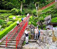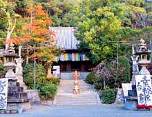 | 【第14番 盛寿山 延命院 常楽寺】 四国霊場のなかで唯一、弥勒菩薩を本尊としている。弥勒菩薩は56億7千万年の後まで、衆生の救済を考え続けて出現するといわれる未来仏である。とくに縁起では、弘法大師が42歳の厄年のころ、この地で真言の秘法を修行していたときに、多くの菩薩を従えて化身した弥勒さまが来迎されたという。大師はすぐに感得し、そばの霊木にその尊像を彫造し、堂宇を建立して本尊にした。後に、大師の甥・真然僧正が金堂を建て、また祈親上人によって講堂や三重塔、仁王門などが建立されて、七堂伽藍がそびえる大寺院となった。その後「天正の兵火」により焼失したが復興、文化15年(1818)に低地の谷地から石段を約50段のぼった現在地の「流水岩の庭」近くに移った。奇形な岩盤の断層が重なって、自然の美しさにとけ込む独特の魅力を醸し出している。また、本堂前には、アララギ大師・地蔵菩薩像(子供の寝しょうべん、夜泣きなどの治癒に祈願)が坐し、1〜18歳までの子供たちを支援している四国霊場ただひとつの児童養護施設がある。 |
