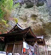 ![]() 常楽寺 奇形な岩盤の断層に立つ本堂 大師堂 後の大木の股に坐すアララギ大師→拡大図 |